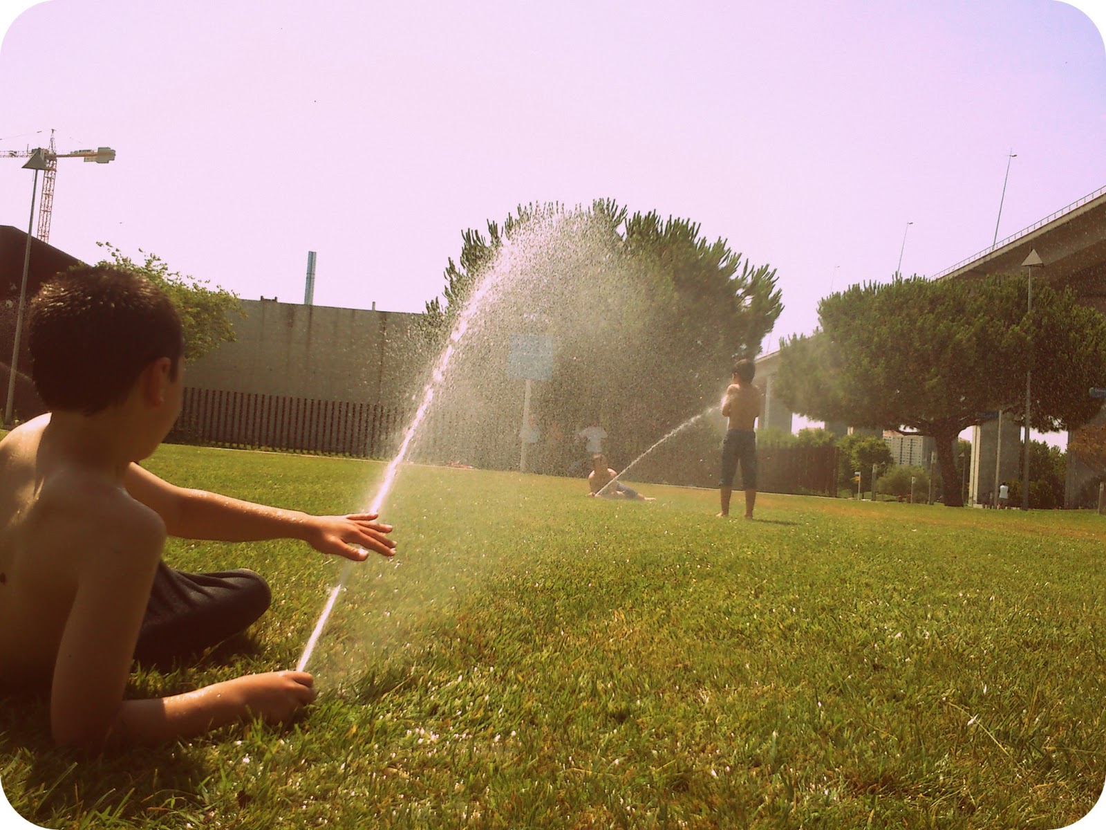 Organizámos um Piquenique-convívio para todas as famílias do ano do H. Foi um dia muito agradável, descontraído e cheio de maluqueiras por parte dos mais novos. Foi trepar a árvores, jogar à bola, às raquetes, andar de bike e skate e quando a meio da tarde a rega foi activada nos relvados do lado (GRAÇAS A DEUS não foi onde estávamos todos refastelados nas mantinhas do piquenique!!!) foi o culminar da loucura. O H chegou ao pé de mim e só disse: "Sei que podes ficar chateada por estar todo molhado, mas lá que foi muito divertido, foi!". Foi só rir! (e é óbvio que não estava minimamente chateada!)